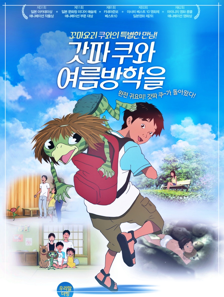 2007년에 하라 케이이치 감독이 만든 애니메이션 작품입니다 일본의 요괴 캐릭터인 갓파 이영화는 만화의 원작이 아니 동화책의 원작으로 만들어진 인본 애니메이션 작품입니다. 2008년에 개봉이 되었고 갓파인 쿠와 일본의 초등학생 코이치의 둘의 우정을 나타내는 그런 작품입니다.