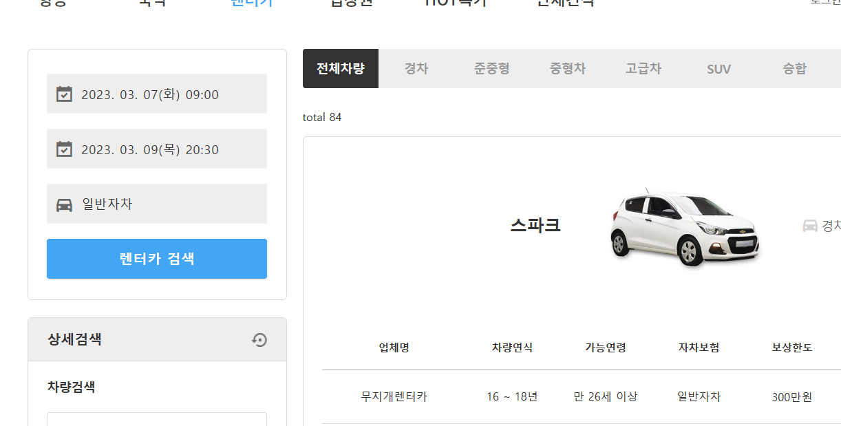 이렇게 메인화면 렌터카 카테고리에 들어가면